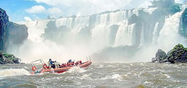 A Speedboat Adventure Up-Close the Iguazu Falls Get ready for a thrilling speedboat adventure, enjoying a unique, up-close perspective of the majestic Iguazu Falls and experience a different viewpoint of the falls from what you’ll see from the panoramic boardwalks. Our speedboat will zip the waters of the Iguazu River and approach the falls getting thoroughly splashed by their mist as you hear their loud roar! This ride provides a unique and extremely close-up view of the Three Musketeers falls with the opportunity to take outstanding close-up photos. To get to the boat dock you’ll ride a truck through the jungle and continue with a navigation up the Iguazu River canyon by the river rapids. Now it’s time to hop on board and begin our waterfall adventure! This tour lasts about 2 hours and is done on the same day you do the Brazilian side of the falls tour. |